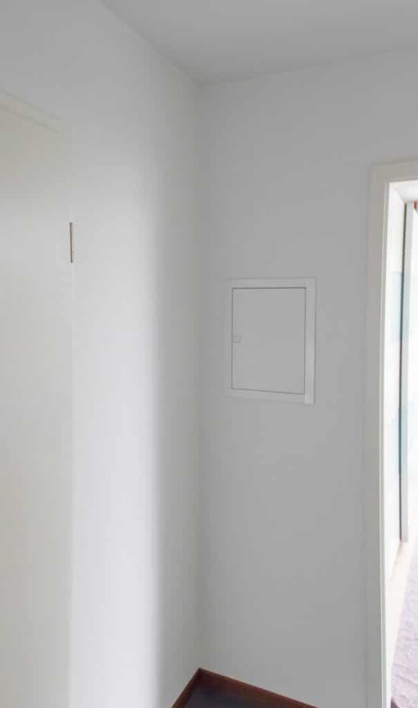 Also habe ich zunächst einmal die Raufasertapete in der Ecke des Flurs entfernt. Zuerst habe ich dafür den Rahmen des Sicherungskastens ausgebaut. Der war einfach nur mit zwei Schrauben fixiert.