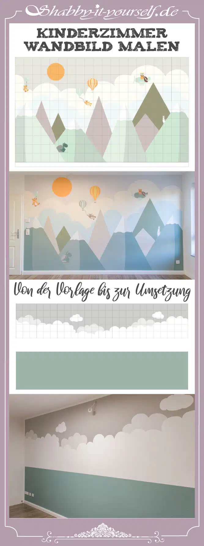 Das zweite Wandbild sollte nun etwas aufwändiger werden. Sicherlich ist mein Entwurf nicht die erste Berglandschaft, die Ihr seht. Die sind gerade der totale Renner und das aus gutem Grund! Mit ein paar einfachen Formen entsteht der Eindruck eines weiten Bergmassivs. In meinem Entwurf habe ich noch ein wenig mit einem 3D Eindruck gespielt und ein paar lustige Tierchen und Heißluftballons mit eingebaut. Denn schließlich soll mein Kleiner später auch was zu gucken haben. 🙂