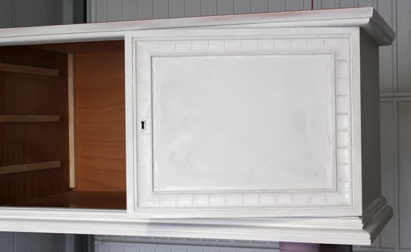 Um die Kassette auf jeder Tür verliefen zwei Rahmen. Um einen dieser Rahmen hervorzuheben und so die Detailarbeit des Möbelstücks zu betonen verwendete ich wieder das „Duck Egg Blue“. Mit einem feinen Pinsel malte ich die umlaufende Linie an und ging dabei bewusst etwas unsauber vor. Die fertigen Türen versiegelte ich nach dem Trocknen wieder mit dem farblosen Möbelwachs. Nach ein paar Stunden Aushärtungszeit schliff ich die Farbe der Türen stellenweise wieder herunter. An dem gründlich gestrichenen Zierrahmen schliff ich manchmal bis auf das Holz, manchmal nur bis zur weißen Farbe darunter. So entstand ein sehr schöner Used-Look. Nach der finalen Versiegelung mit Wachs waren nun auch die Türen fertig.