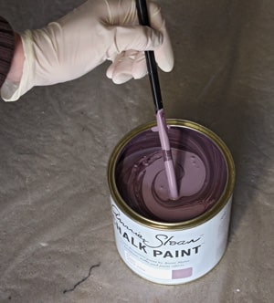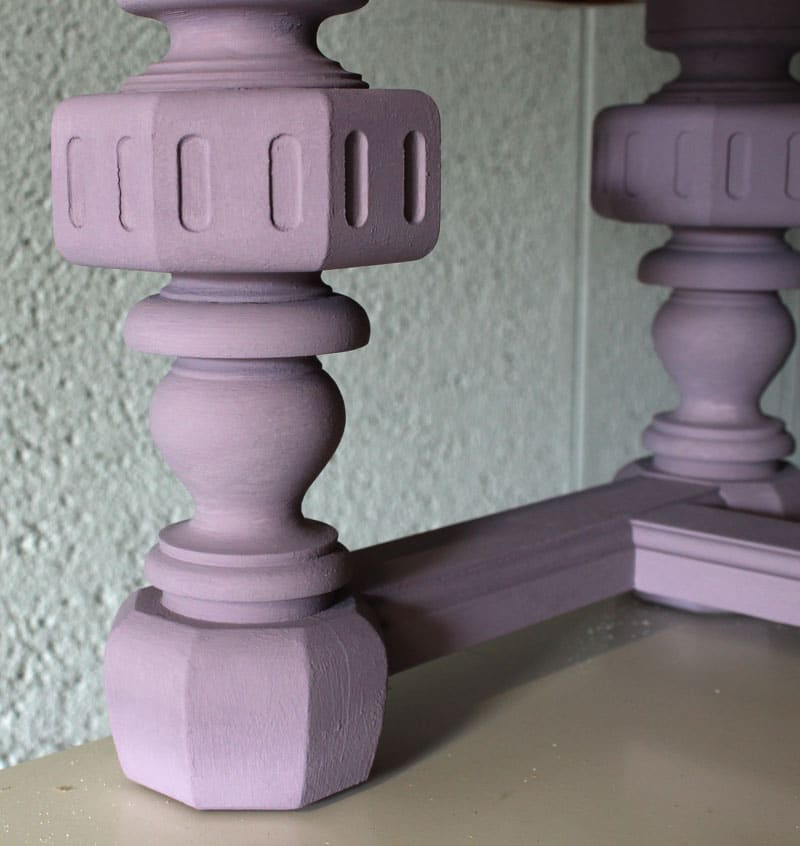 Da der Unterbau komplett in lila noch etwas langweilig wirkte, wollte ich ihm nun ein interessantes Finish geben. Hierfür verwendete ich das Soft Wax mit ein wenig Kreidefarbe im Farbton „Duck Egg Blue“, ein mattes Grün mit einem Hauch von Blau. Auf einem Pappteller mischte ich beides zusammen, was sehr leicht ging, da sich die Texturen sofort miteinander verbanden.
