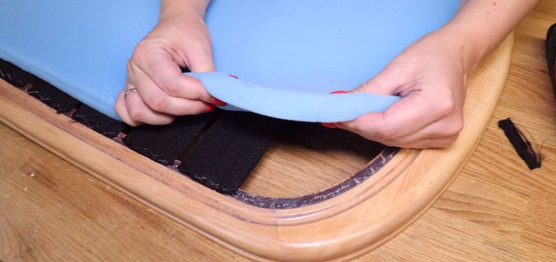 Bei dem alten Sitzpolster schützten Schaumstoffecken das Holz vor den Wellenfedern. Also tackerte auch ich nun zunächst kleinere Schaumstoffstücke an den Ecken des Rahmens fest.