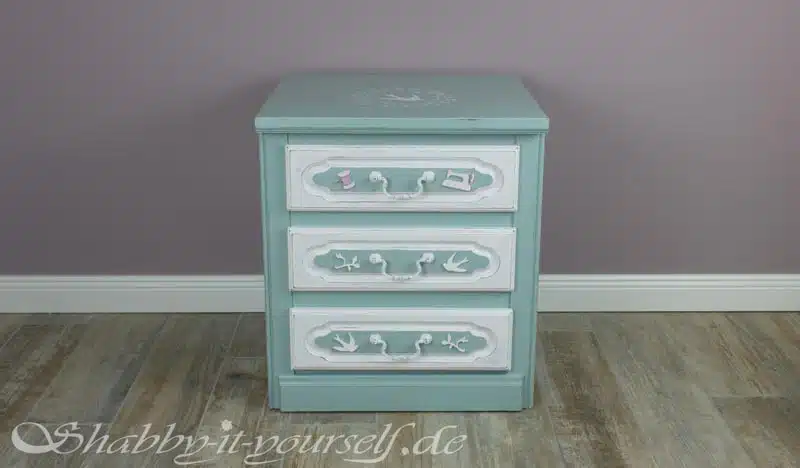 Arbeitsaufwand: ca. 6 Stunden Materialkosten: ca. 100€ (wenn Ihr alles neu kaufen müsst) Eingesetzte Materialien: Synthetikpinsel in verschiedenen Größen (ca. 3€/Stück) Malerkrepp (Abklebeband) (ab ca. 1€/Rolle) Shabby Versiegelung von Lignocolor (ca. 15,95€/750ml) Painting the Past Möbelkreidefarbe “Mint” (34€/750ml-Dose) Farbe Lignocolor Old Shabby Chic “Weiss“ (11,95€/0,5kg-Dose) Schablone von Martha Stewart (16€)…