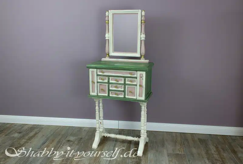 Schminkkommode aufarbeiten: ca. 20 Stunden Materialkosten: ca. 110€ (wenn Ihr alles neu kaufen müsst) Eingesetzte Materialien: Schleifpapier verschiedene Körnungen (ca. 5€/Rolle) Synthetikpinsel in verschiedenen Größen (ca. 3€/Stück) Malerkrepp (Abklebeband) (ab ca. 1€/Rolle) Farben (alle von Gäbig+Mätteli): Shabby Chic Isoliergrund Weiß (16,99€/375ml-Dose) Elfenbein Shabby Chic Kreidefarbe (16,99€/375ml-Dose) SalbeigrünShabby Chic Kreidefarbe (16,99€/375ml-Dose)…