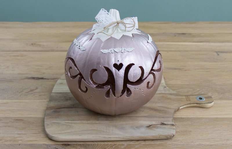 Nachdem er getrocknet war, nahm ich goldenen Metallic-Lack von Rust-Oleum zur Hand und malte damit die Vertiefungen für den Mund und die Augen aus. Diese kleinen Flächen waren für den roségoldenen Sprühlack zu filigran. Aber mit viel von dem goldenen Lack auf dem Pinsel für die feuchten Schnittflächen, funktionierte das mit dem Auftragen ganz gut. Noch schnell zwei böse Augenbrauen aufgemalt und ein wenig Kordel auf dem Kopf drapiert und schon war mein kleines, gruseliges Shabby Chic Monster fertig! 🙂 Das gesellte sich nun auch zu den anderen beiden Kürbissen.